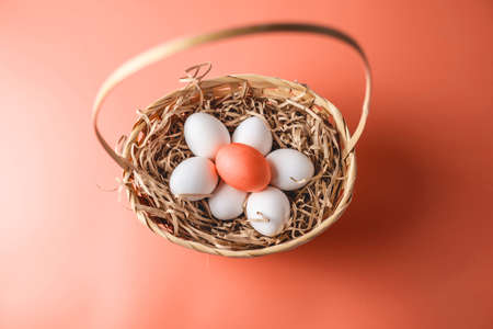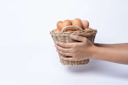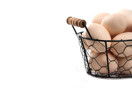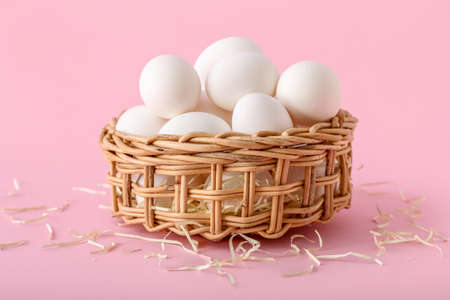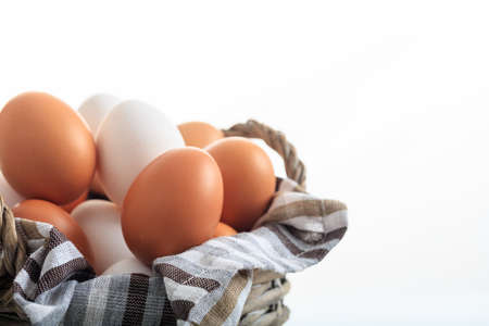 Wicker bamboo basket filled with fresh chicken eggs, white background, food and nutrition ads, ample copy space