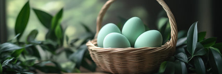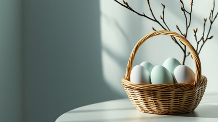 A stunning image featuring a variety of colorful eggs arranged in a rustic woven basket against a light background. Perfect for springtime or Easter themes.