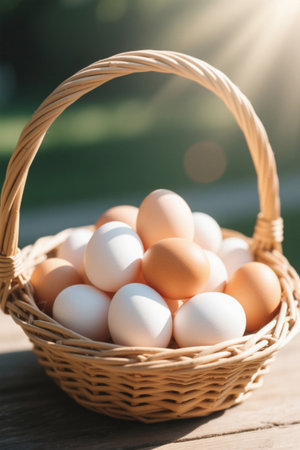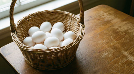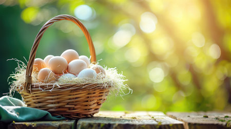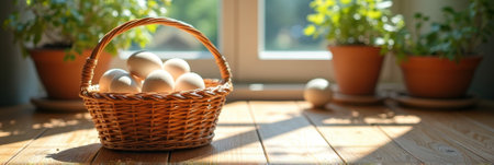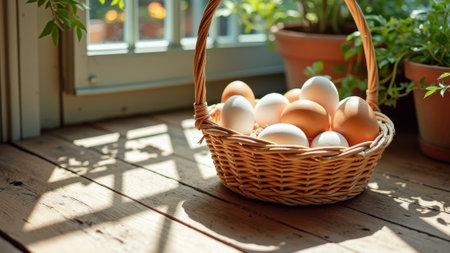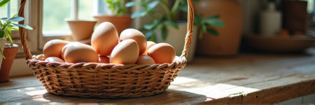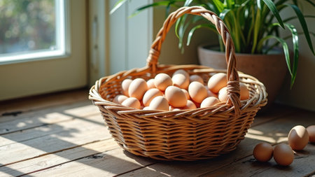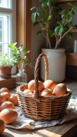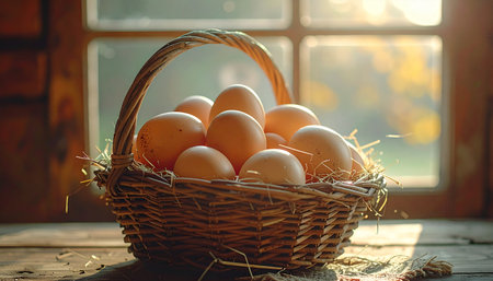 A rustic wicker basket filled with fresh brown eggs rests on a wooden surface, bathed in the warm, golden light of the morning sun streaming through a window. This image evokes a sense of wholesome country living, farm-to-table freshness, and the simple joys of a new day.