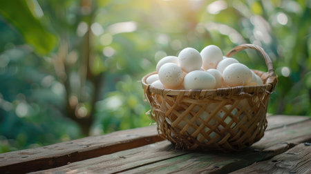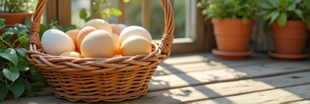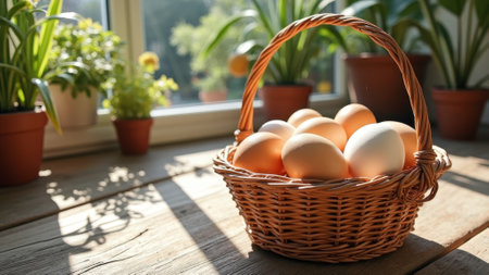 Sunlit basket of farm fresh eggs on a wooden porch with potted plants. That the image is generated using AI.