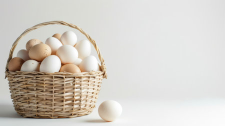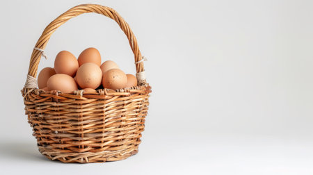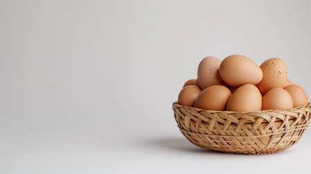 Fresh chicken eggs in wicker basket, white background, ample copy space, perfect for food and nutrition ads