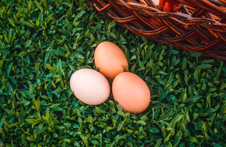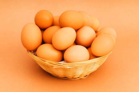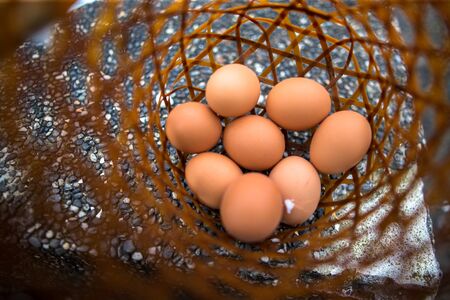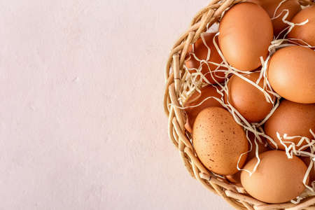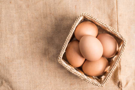 Close up of eggs in a basket. top view of eggs in bowl. Brown eggs in wooden bowl.