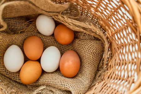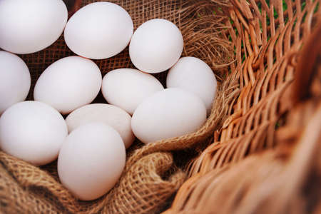 Organic rustic white chicken eggs close-up on natural burlap bedding in a basket , organic food from the village.
