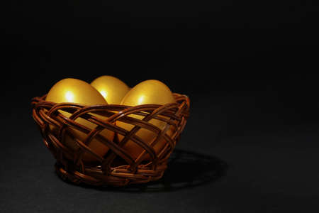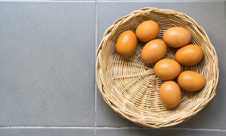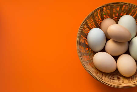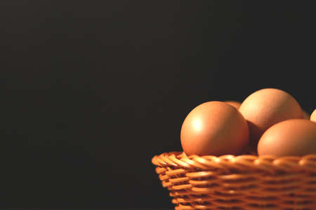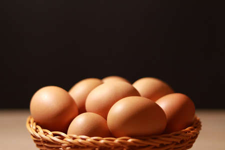 Fresh Chicken eggs in Bamboo basket on a dark gray background.
