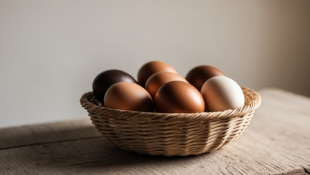 A wicker basket filled with freshly gathered brown eggs sits on a rustic wooden surface. Warm, golden sunlight streams through a window, illuminating the scene and promising a wholesome, farm-to-table breakfast. This image evokes feelings of nostalgia, simplicity, and the start of a new day.