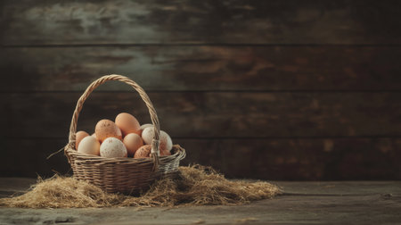 Wicker basket full of fresh organic chicken eggs is placed on a bed of straw on a rustic wooden table, creating a charming farm fresh scene