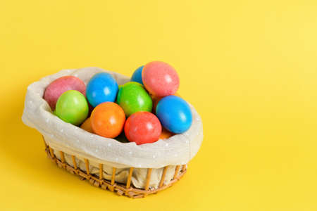 painted colorful eggs in a basket for the Easter holiday yellow background.