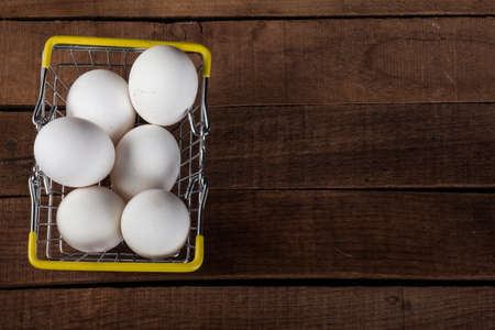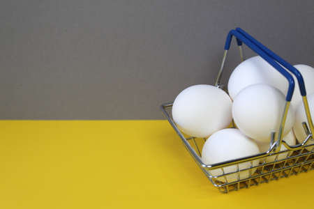 Chicken eggs in a shopping cart. Eggs in the store. Fresh food on the shelf. food basket. Close-up on a white background top view.