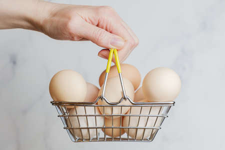 Woman's hand holds a metal shopping basket with large chicken eggs. Farm chicken eggs produced in our own chicken coop. Diet fresh product.