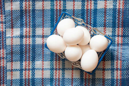 White chicken eggs in a basket from a supermarket on a checkered client in the kitchen, eggs from a supermarket, food