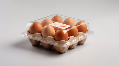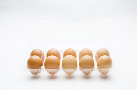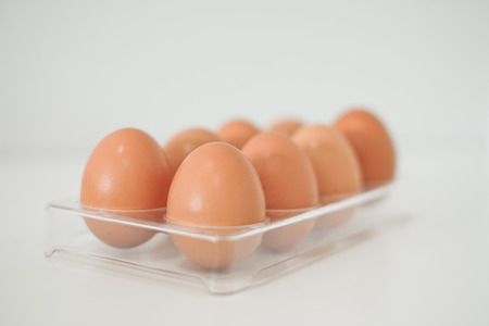 Close-up of fresh brown eggs in a plastic box on a white background, copy space
