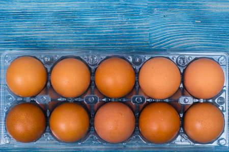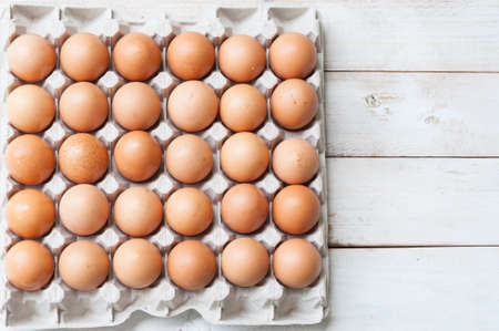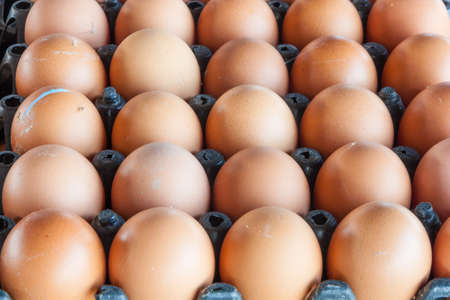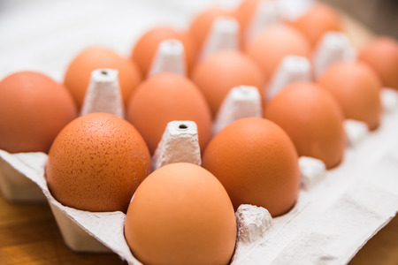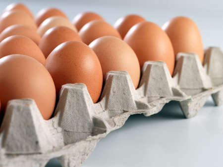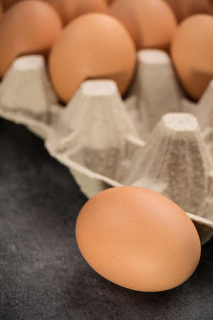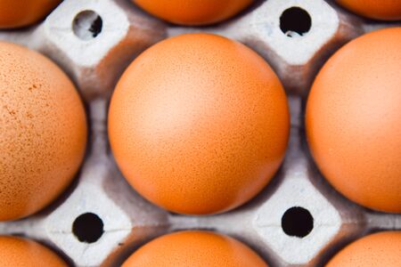 Raw chicken eggs in a cardboard tray, farm brown eggs background.