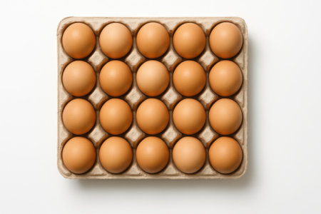 Brown eggs in paper container top down flat lay with rows neatly aligned and edge lifted to show natural carton texture