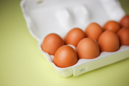 Brown eggs in expanded polystyrene packaging on an isolated light yellow background