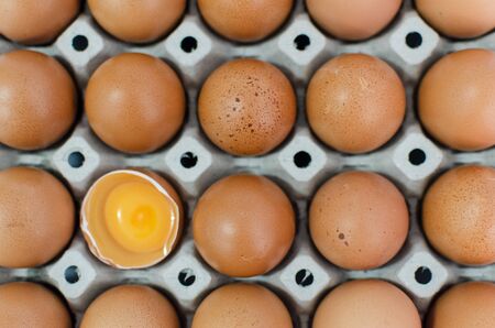 White raw chicken eggs and alone broken brown egg in a tray top view