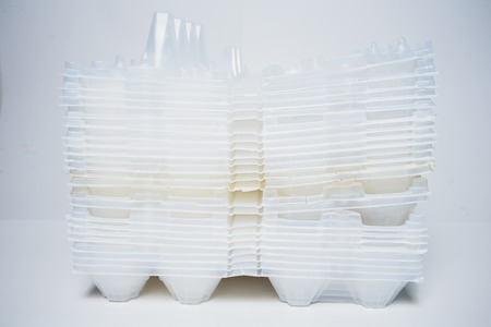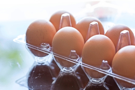 chicken eggs in plastic package on the table backdrop of natural light in the morning.