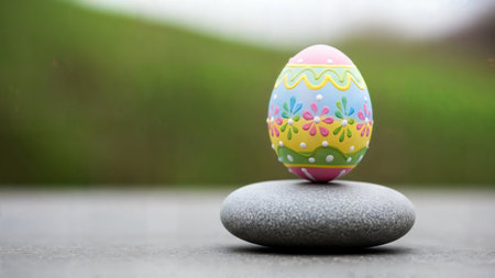 Brightly decorated easter egg with cheerful patterns rests on a smooth gray stone in a natural outdoor setting.