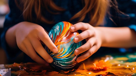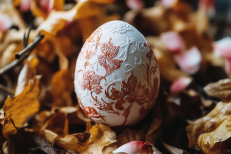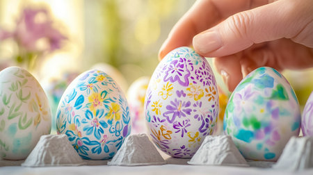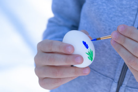 A close-up photograph of a pair of hands painting a beautifully intricate floral pattern on an Easter egg. The rich details and warm lighting enhance the festive atmosphere of Easter.