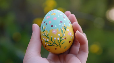 A beautifully designed hand-painted Easter egg featuring vibrant floral patterns, held gently in a hand and surrounded by natural greenery.