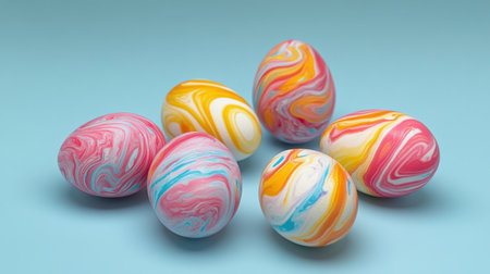 A charming arrangement of marbled, colorful Easter eggs sitting beautifully on a soft blue background. Perfect for spring celebrations and festive decor.
