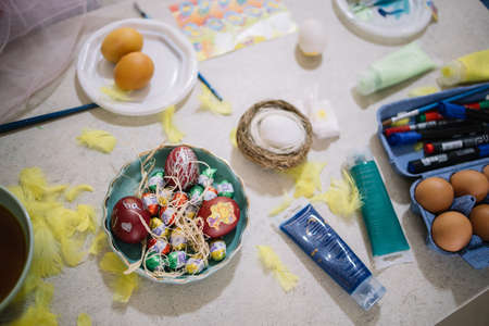 Top view of bowl with eggs and candies for Easter. Chocolate mini eggs in a bowl with painted eggs on kitchen table with yellow feathers, nest, brushes and paint.