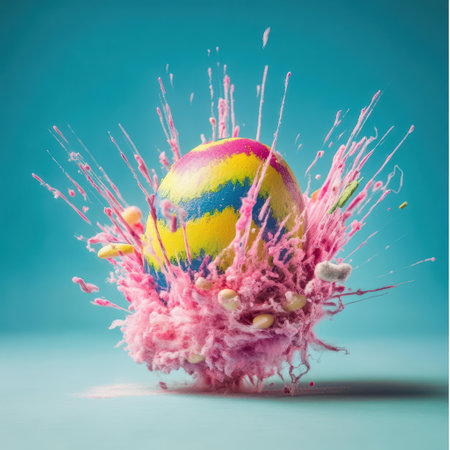 A vibrant egg bursts splattering pink and yellow everywhere creating a lively atmosphere perfect for celebrations!