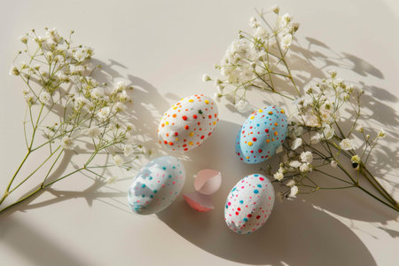 Colorful easter eggs and white babys breath flowers on a bright surface