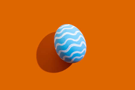 Easter art. Festive ornament. Spring holiday. Handmade decoration. Abstract background. Blue egg with white pattern waves isolated on orange copy space.