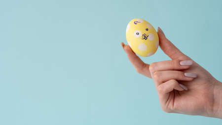 Happy Easter. Holiday ornament. DIY food decoration. Greeting card. Color egg with white creative minimal pattern in woman hand isolated on blue copy space background.