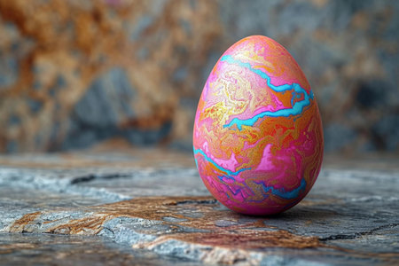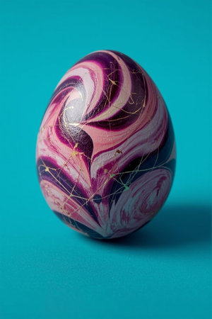 Single egg with marbled pink, purple, and white design accented by gold lines. Set against turquoise background. Perfect for Easter, art, and creative decoration.