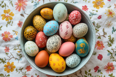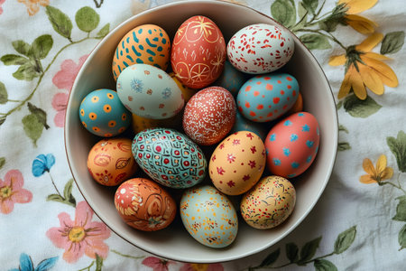 Bowl full of colorful easter eggs decorated with different patterns, resting on a floral tablecloth, celebrating the spring holidays