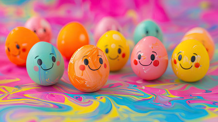 Close-up of eggs with cute faces drawn on them, set against an abstract colorful background, creating a playful and vibrant scene.