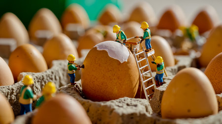 A group of small figurines dressed in hard hats are working on a large egg that has been cracked open