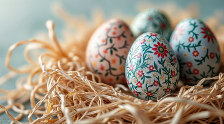 Intricately painted easter eggs are resting gently on a soft nest of straw, showing vibrant floral designs perfect for spring celebrations.