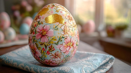 A close-up of an intricately hand-painted Easter egg with a pretty floral pattern. Pastel colors and gold accents add a touch of elegance.