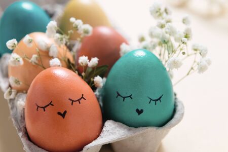 Colored Easter eggs in tray with funny or cute faces, greeting card for holidays, spring flowers