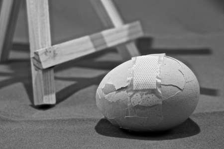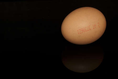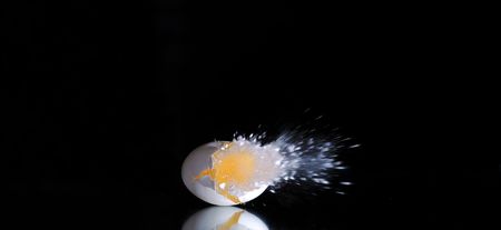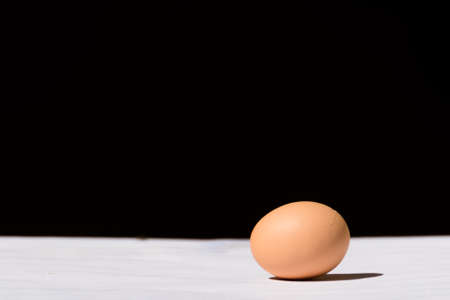 Humor, concept photo, an upset egg is looking regretfully at a fresh egg yolk on the black background