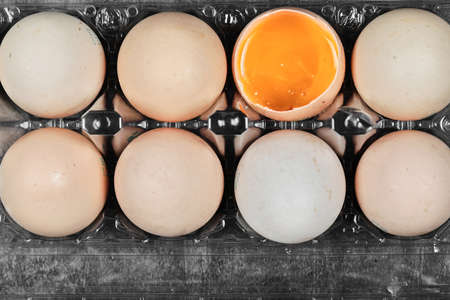 Close-up of a single broken egg with vibrant yellow yolk among a row of white eggs. Clean, minimalistic composition with soft focus.