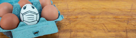 CORONAVIRUS: Easter background banner panorama -Close-up from eggs in egg carton with mouth mask on rustic wooden table