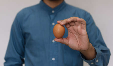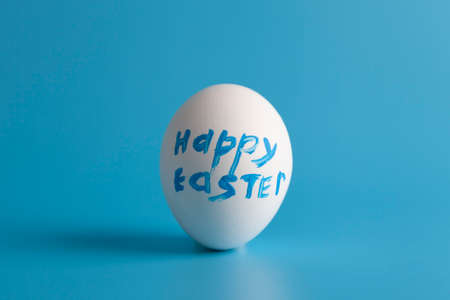 A hand in a protective medical glove holds or gives a white egg on a blue background, copy space, close-up
