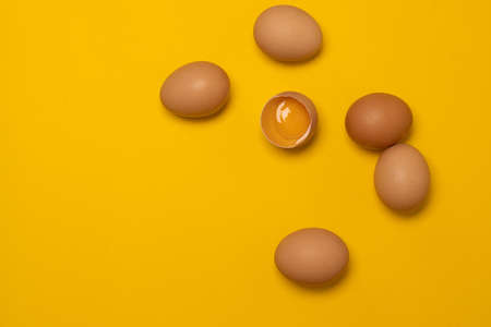 Organic brown chicken eggs and one broken egg with yolk on yellow background