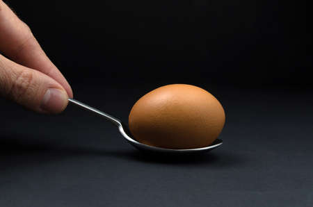Egg on two forks. Chicken egg stands on two forks. Abstract still life, two forks and egg on a black background.