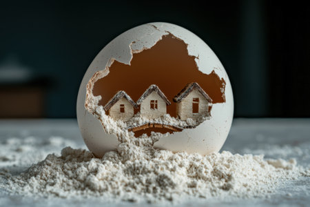Miniature houses inside a cracked eggshell on a pile of flour.