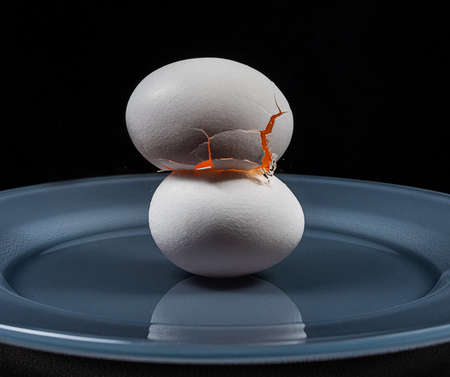 Baking, pastry making or tasty breakfast concept. Two cracked eggshells with strong light and shadows on white cutting board. High quality photo