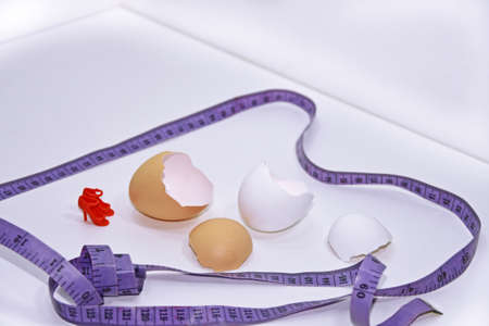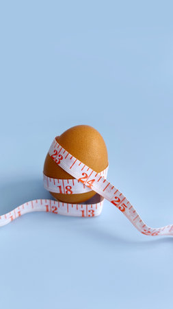 Portrait view of raw egg wrapped with measuring tape on blue background, representing healthy diet, weight loss, portion control, and high protein nutrition concept with copy space