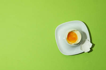 Whole boiled chicken egg, peeled from shell, lies on table, and next to it cut egg so that yolk is visible. Minimalistic restaurant menu.