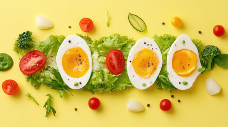 Four halved boiled eggs with lettuce, cherry tomatoes, cucumber, broccoli, spinach and peppercorns on a yellow background.