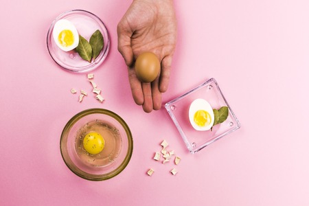 White egg with peeled boiled eggs in pink plate on purple pink colors plain minimal background, top view, happy Easter day