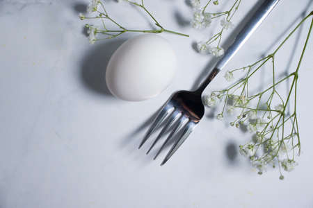 Fork and knife on pastel blue background with white plate and egg. Minimal layout composition. Flat lay arrangement.