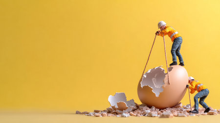 A group of small figurines dressed in hard hats are working on a large egg that has been cracked open